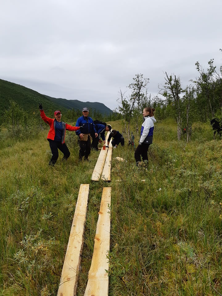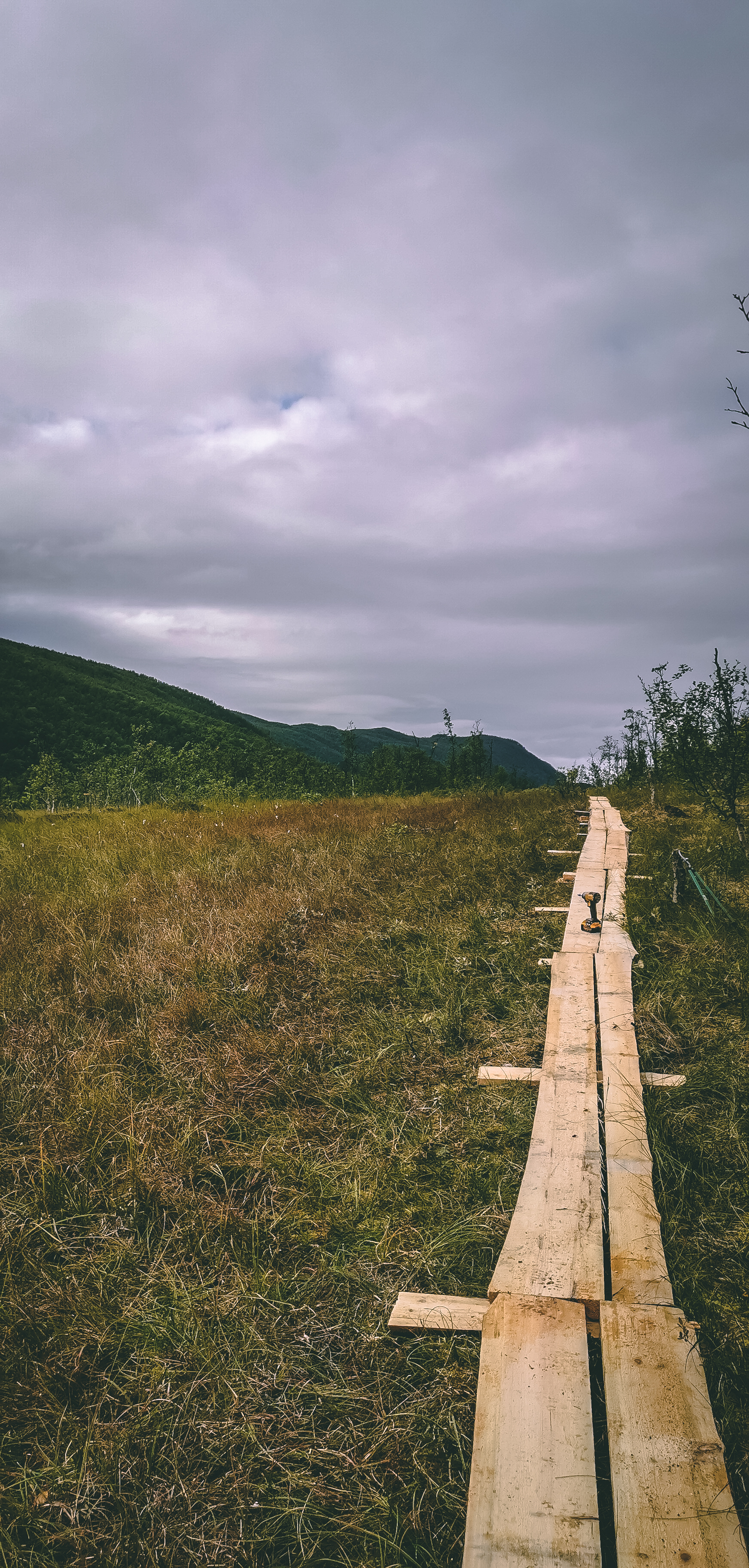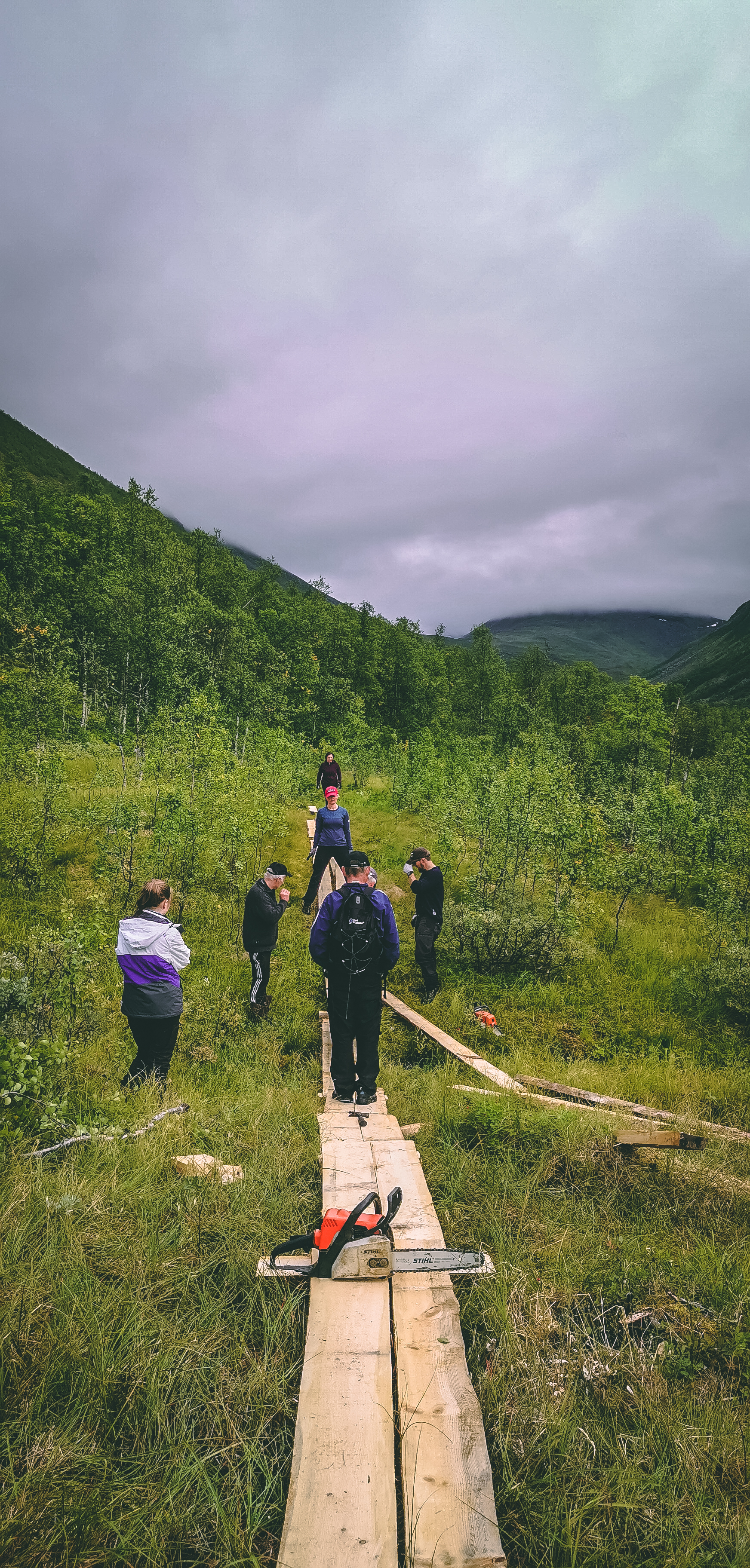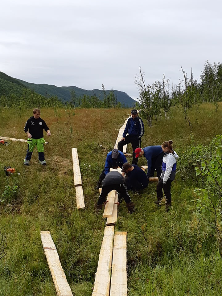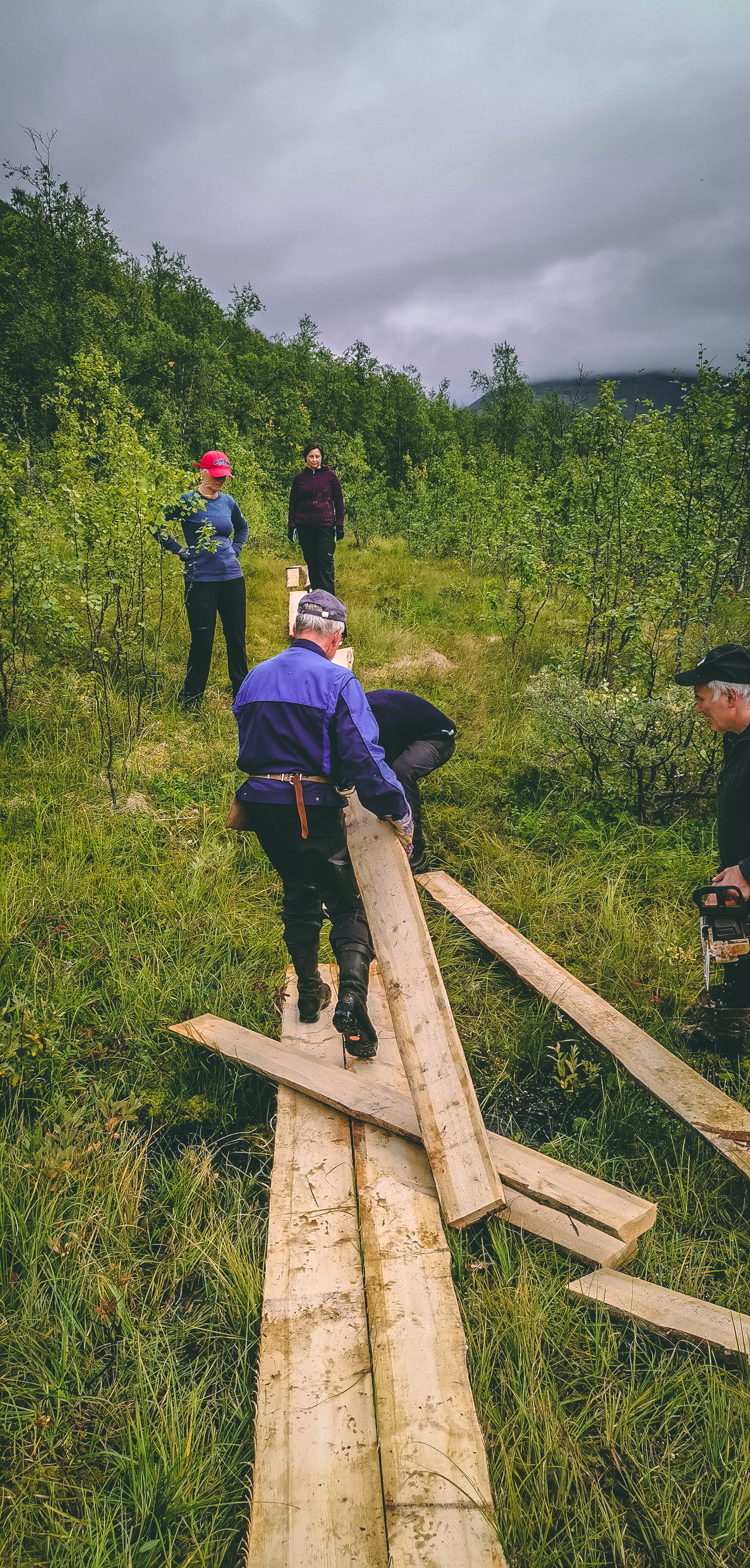 I år ønsker vi å fortsette kloppingen (legge plank) over Myrhøgda inn mot rundvannet. Vi har fått nytt lass med plank som må bæres, sages,……